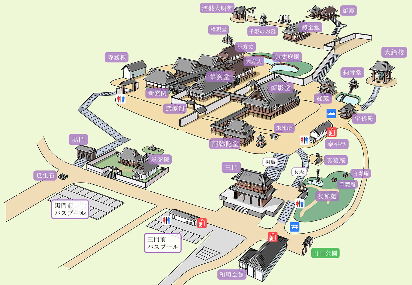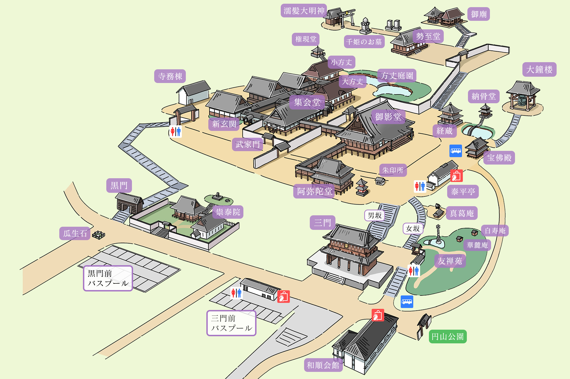 知恩院三門前(境内案内看板前)から御影堂前(泰平亭前)まで、無料シャトルバスを運行しています。