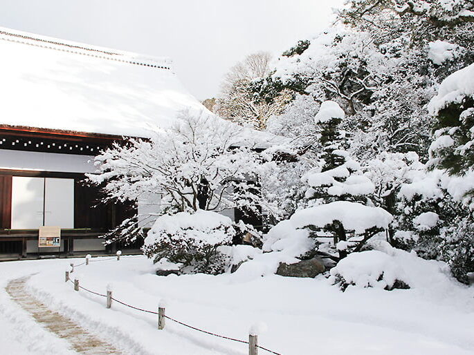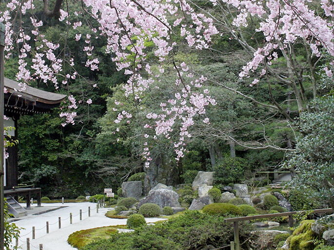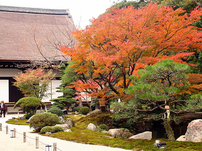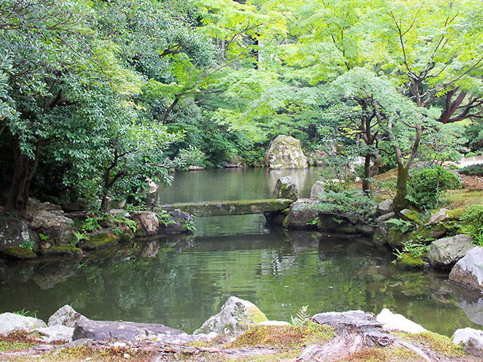 池泉庭園で、方丈の華麗な建築と背後に迫る東山の風光とともに、情緒あふれる美しい風景を醸しだしています。