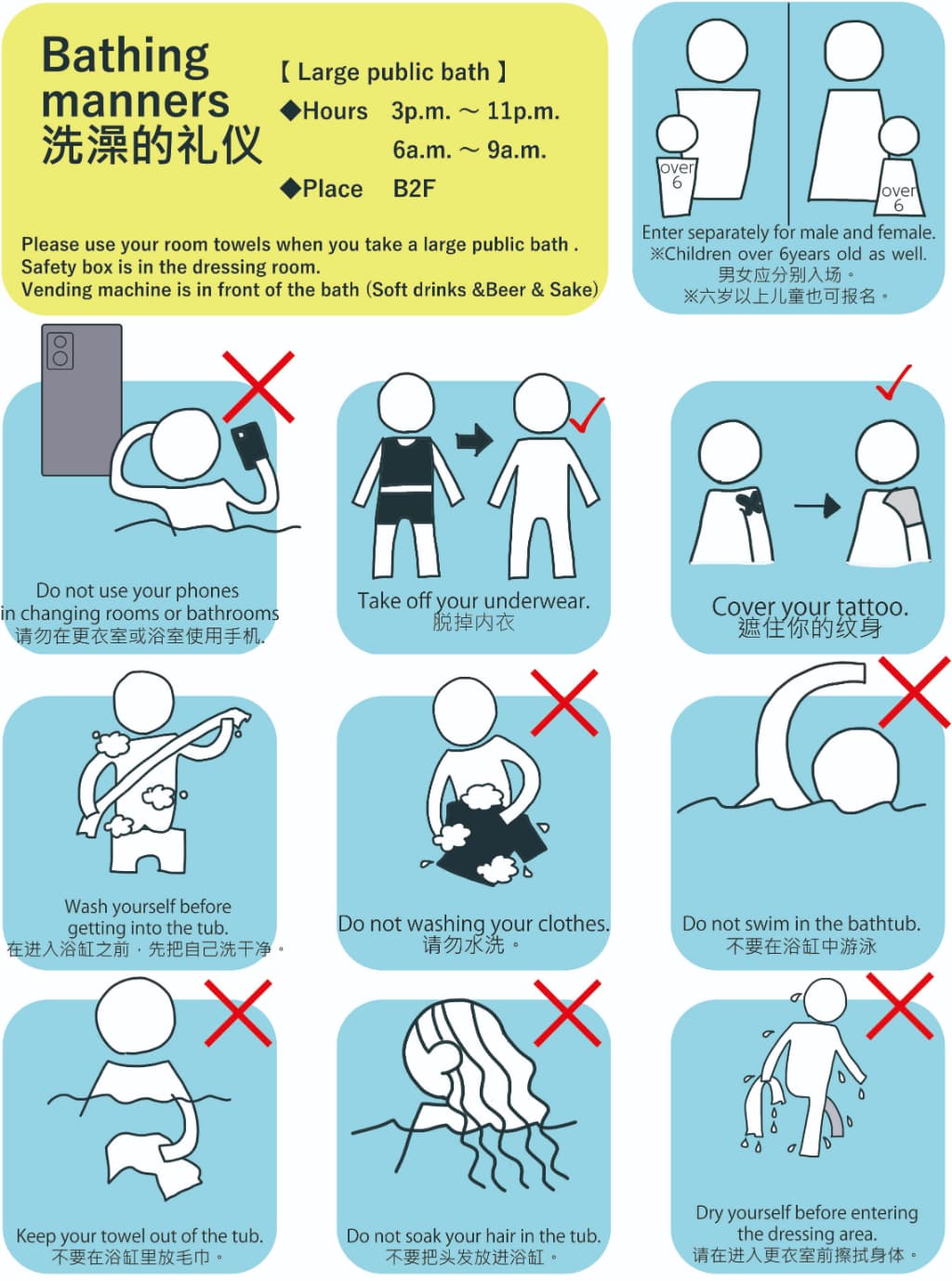 To ensure everyone enjoys a pleasant bathing experience, please follow the rules below when using the public bath.