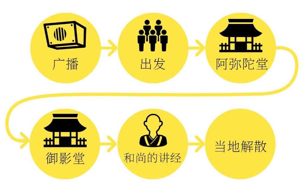 请于 6:10 前在 1 楼前台附近集合,工作人员将引导您前往知恩院内的法要大殿。